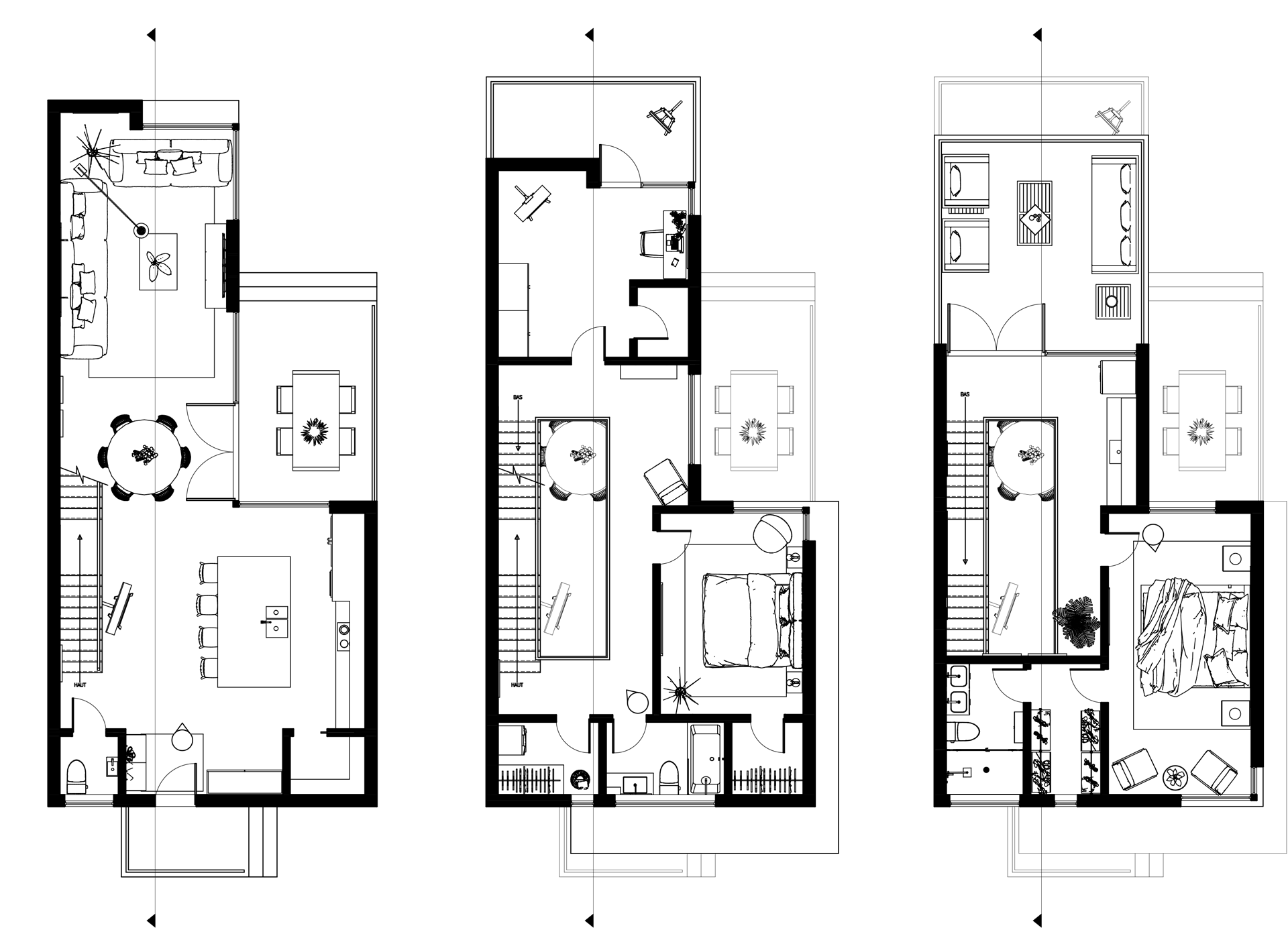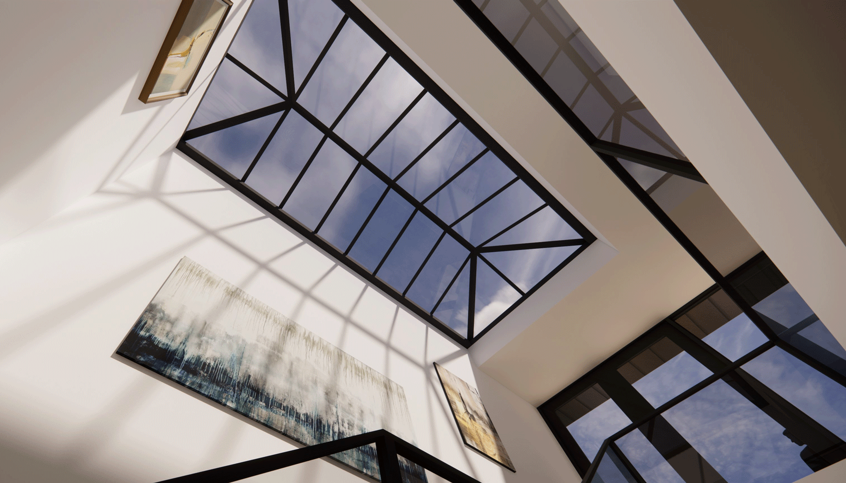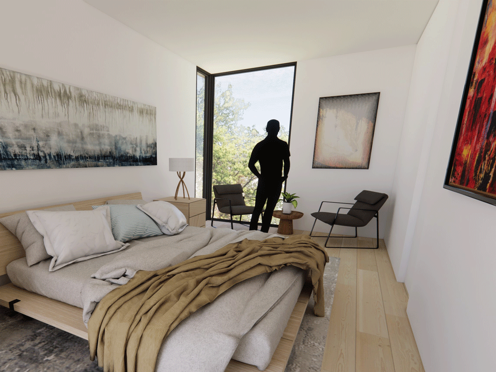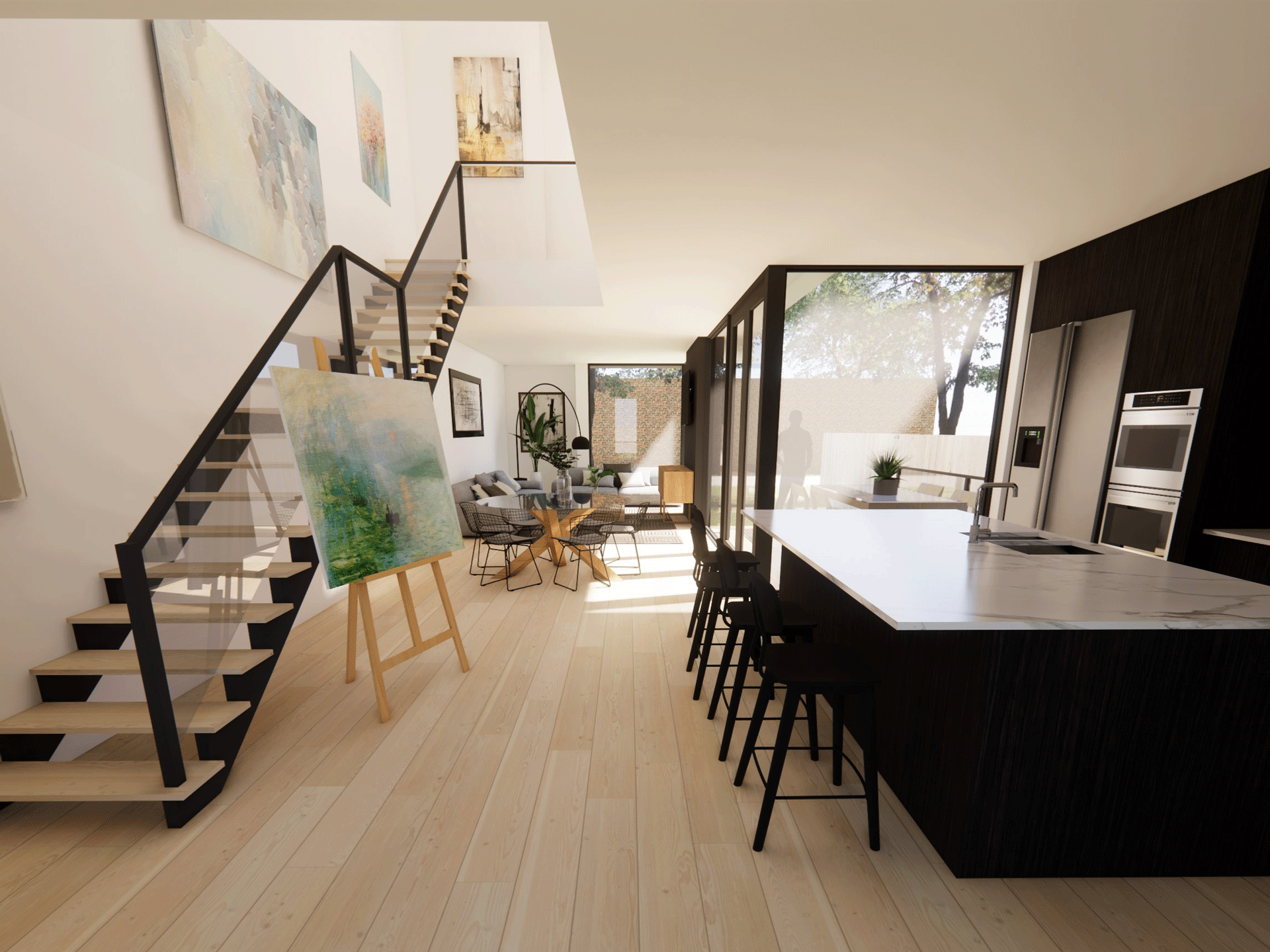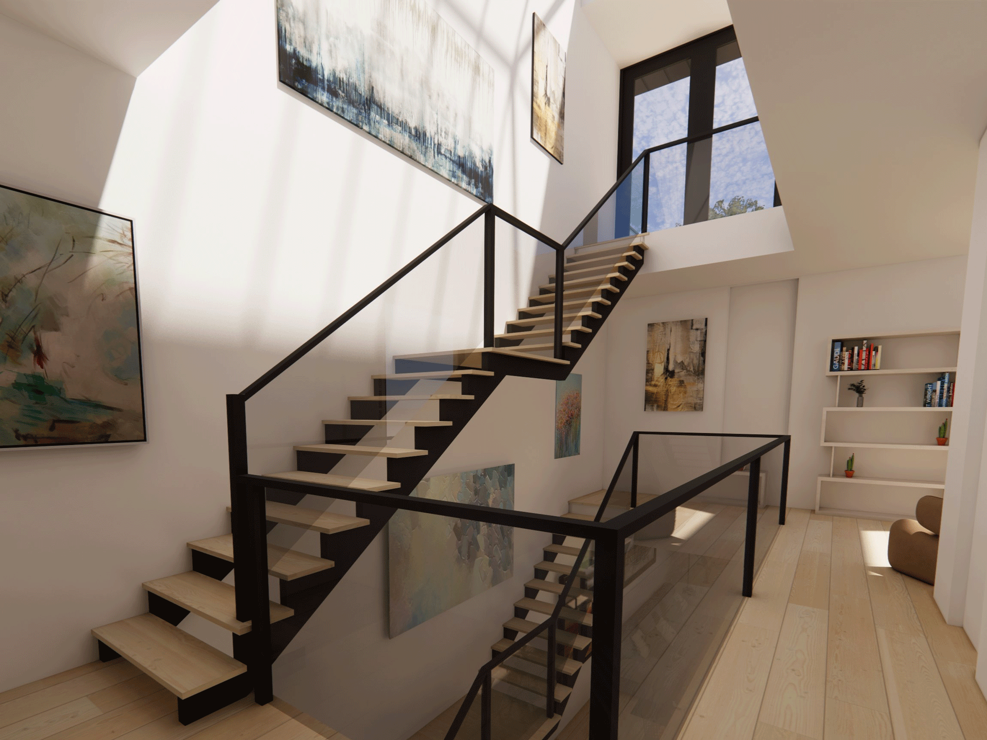 La lumière naturelle est au coeur du projet et a été amenée grâce aux grandes fenêtres qui lui permettent de pénétrer généreusement dans les aires de vie ainsi que dans la cage d’escaliers qui bénéficie d’un large puit de lumière. La grandeur et la verticalité sont également intégrés de manière à créer un environnement luxueux et contemporain. Finalement, la volumétrie et la géométrie ont été pensées de manière à prolonger les espaces intérieurs jusqu’à l’extérieur avec trois terrasses ainsi qu’en créant des racoins, des creux et des décrochés pour sortir de la boite rectangulaire et créer diverses ambiances et un esthétisme à la fois cohérent et irrégulier.